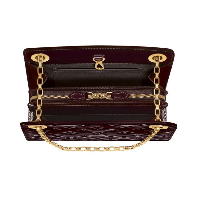 洗練されたフォルムのバッグ「ヴァージニアPM」。エンボスが施されたモノグラム・ヴェルニのパテントレザーが美しさを引き立てるアイテム。光沢のあるゴールドの真鍮メタルピースの120cmチェーンストラップ付。 |